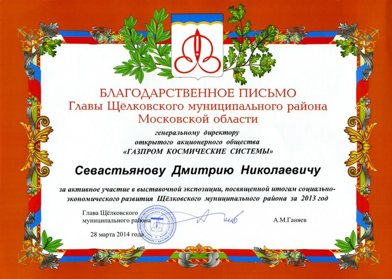 В «Газпром космические системы» поступило благодарственное письмо Главы Щелковского муниципального района Московской области Александра Матвеевича Ганяева за участие в выставочной экспозиции, посвященной итогам социально-экономического развития Щелковского муниципального района за 2013 год.